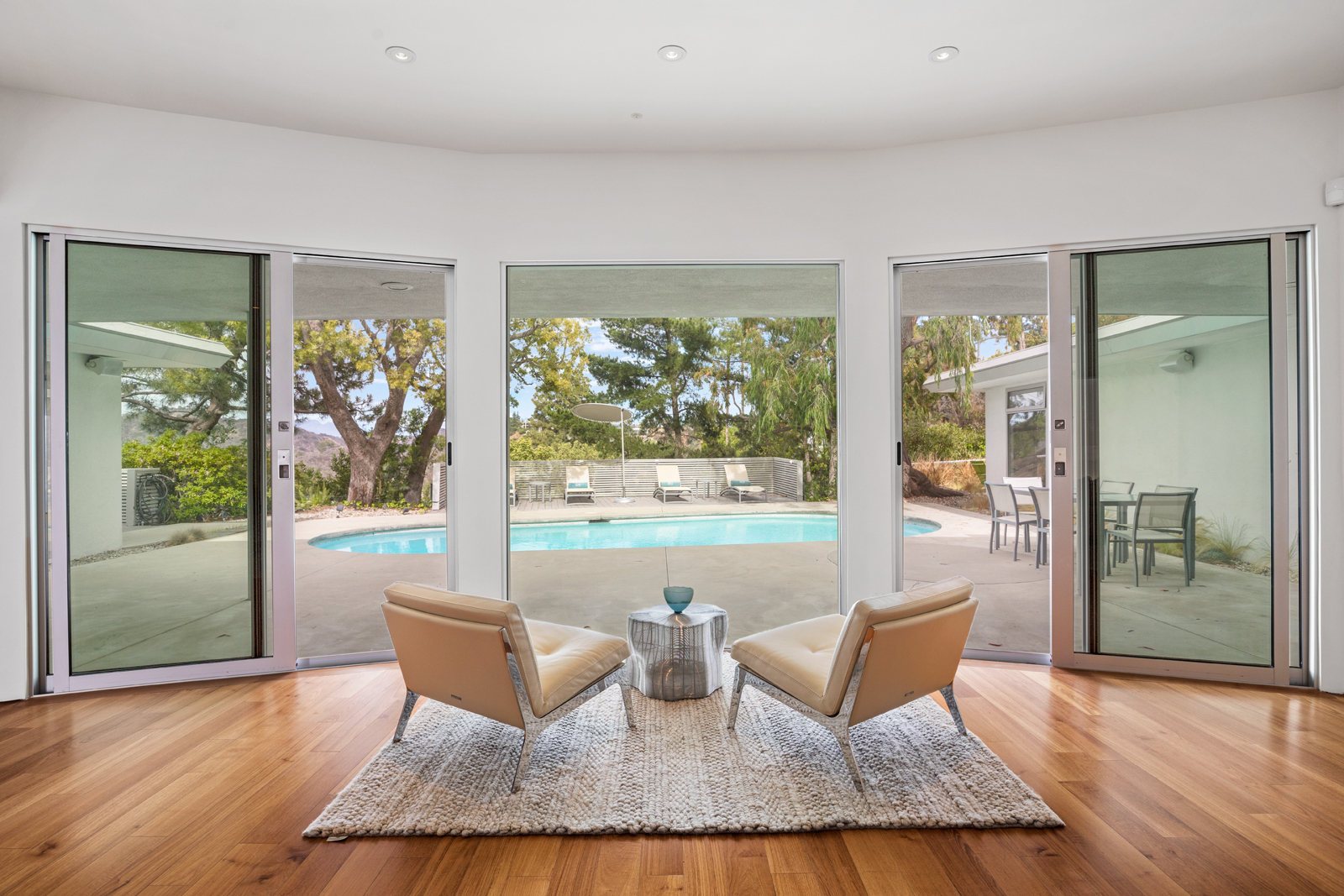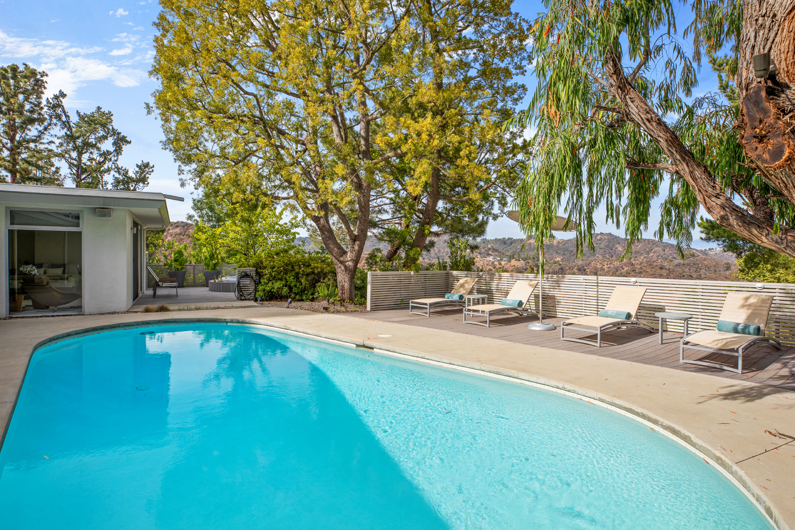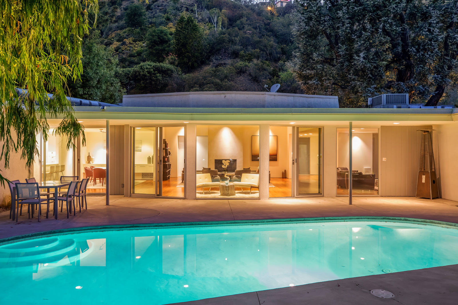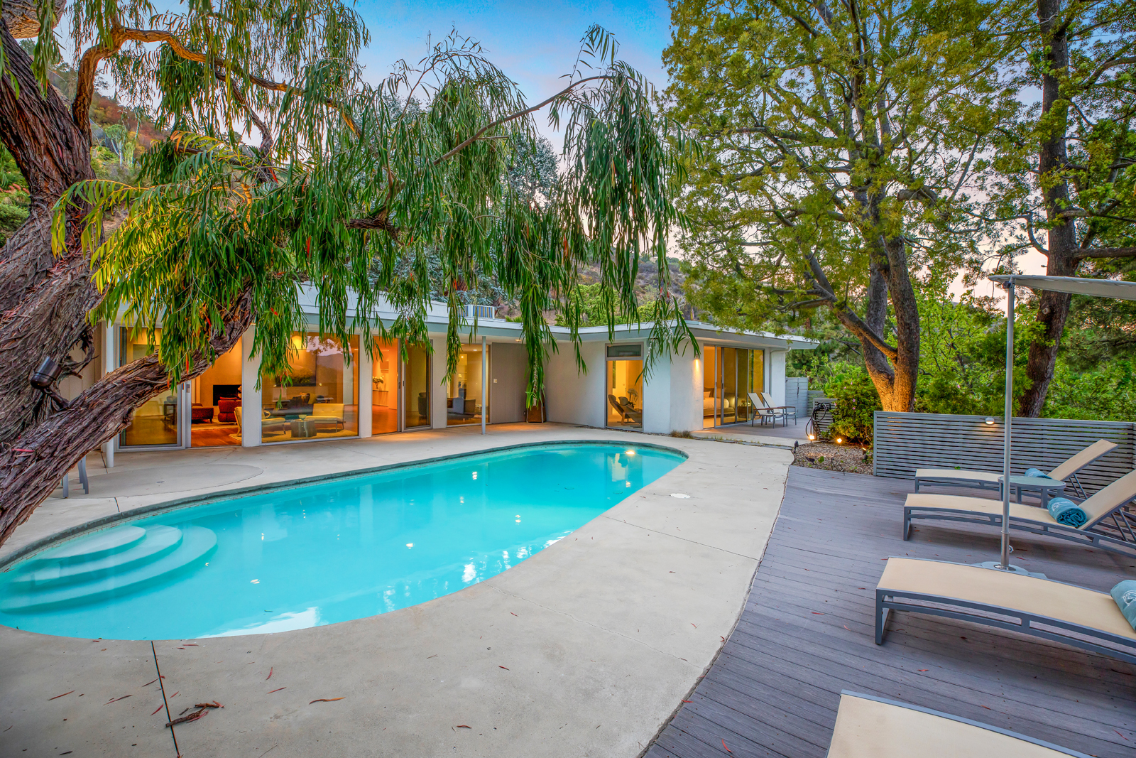 Light-filled, Mid-Century residence by California architect Charles Wong, A.I.A., perched near the top of Stone Canyon Road in Bel Air on a generous, 12, 000+ sf lot with pool, spa, fire pit and reservoir views from most rooms. The bright entry seamlessly flows to the living room with fireplace, media room area, dining room and modern kitchen with stainless steel appliances, all with warm, teak wood floors and ample room for your special art collection. Fleetwood sliding doors lead to large entertaining terrace, pool, sun terrace, spa, fire pit and exquisite views. Large, main bedroom with terrace and modern bathroom w dual vanities, walk-in shower and generous bath. Two additional bedrooms and baths complete this warm, modern retreat surrounded by nature yet minutes away from all that LA has to offer.